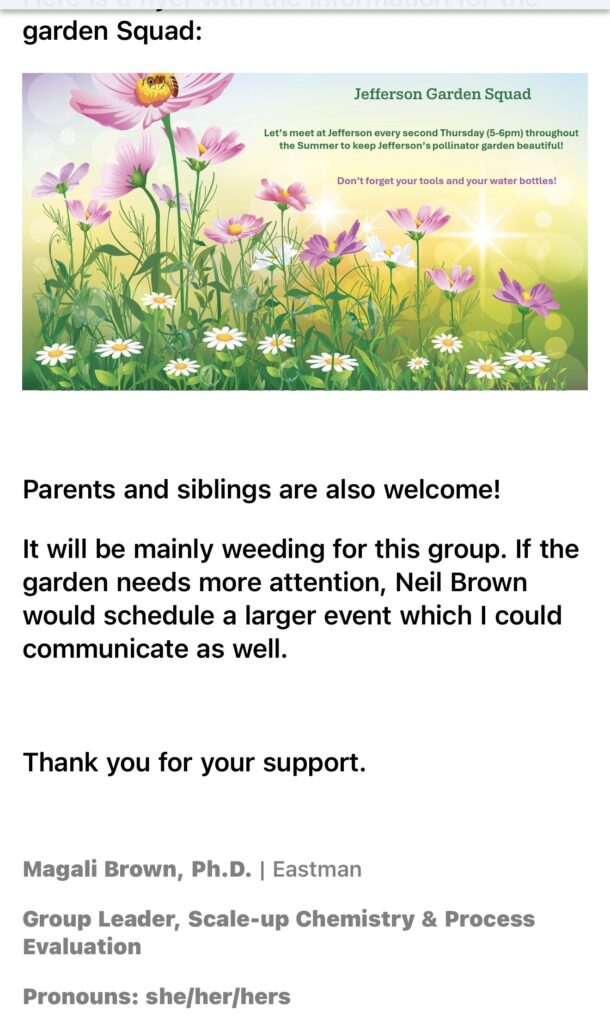 Mr.Brown is leading and starting in April a Garden Squad at Jefferson Elementary School to keep their pollinator Garden beautiful throughout the Summer.
