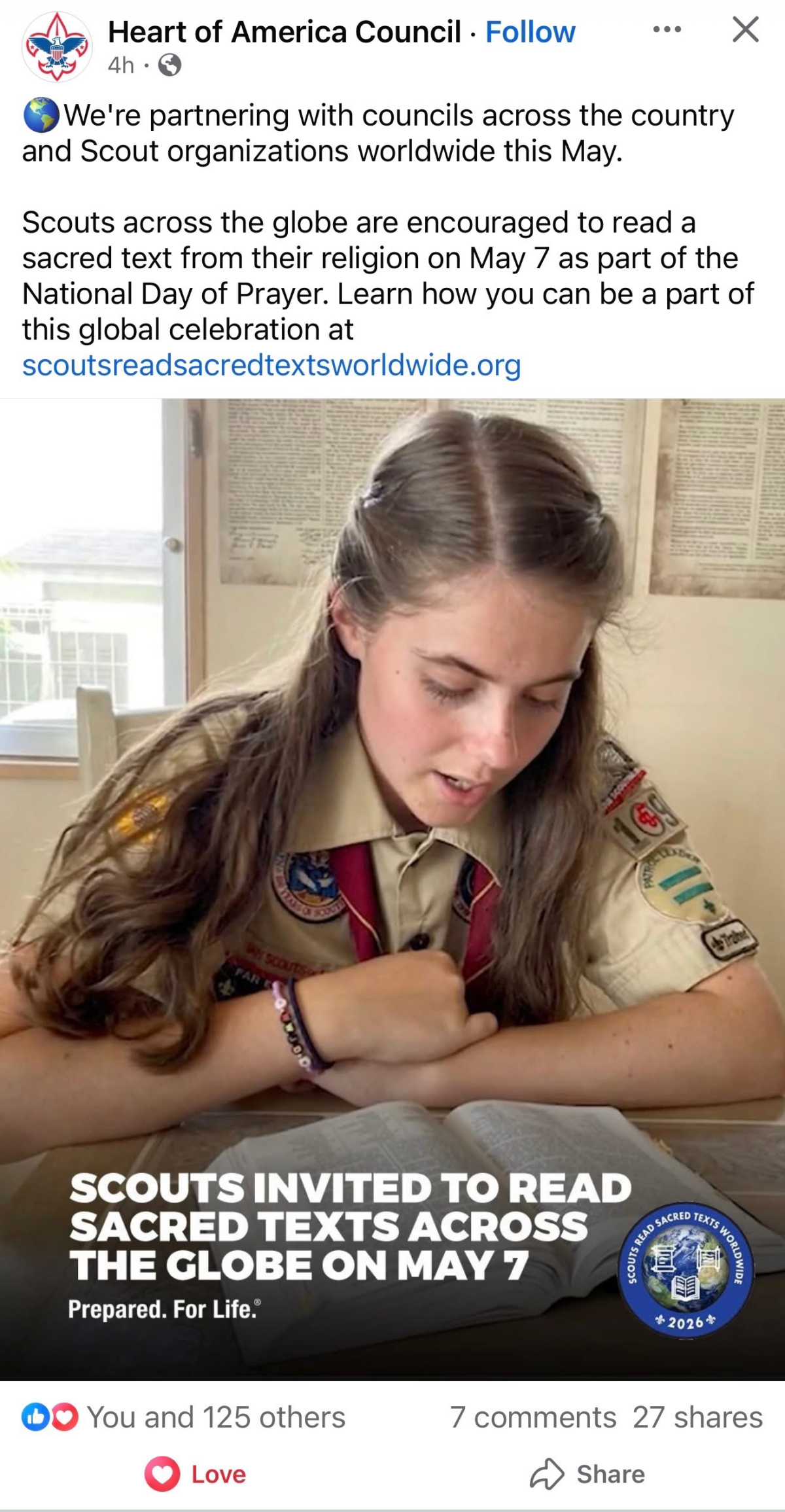 Our troop is joining Scouts across the globe in reading a sacred text from our faith on May 7 as part of the National Day of Prayer.Be part of this global Scout effort:https://scoutsreadsacredtextsworldwide.org#Scouts #NationalDayOfPrayer #FaithInAction
